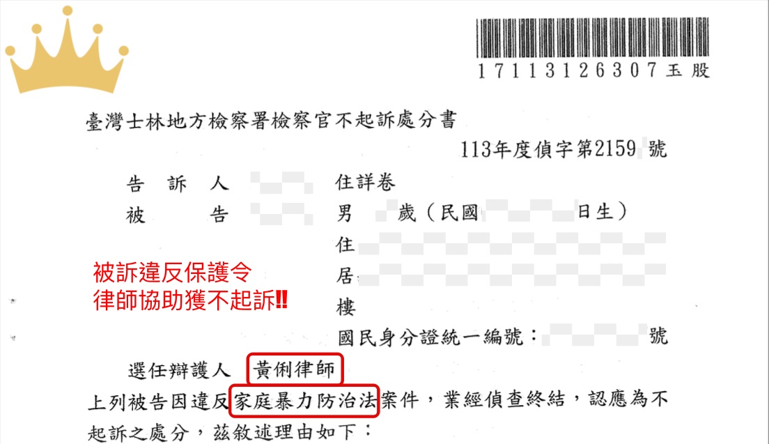 賀!本所黃俐律師受託擔任【刑事家暴保護令案】之偵查中辯護人
