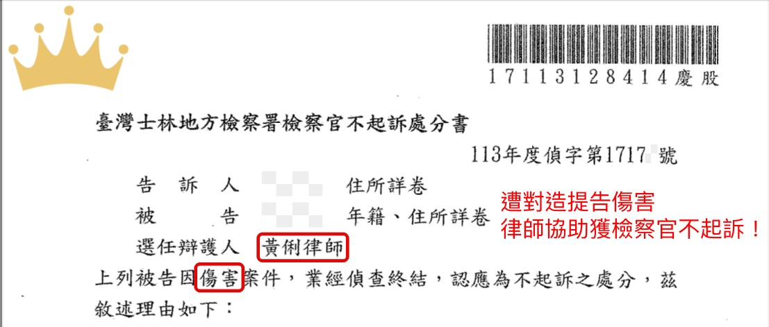 賀!本所黃俐律師受託擔任【刑事傷害案】之偵查中辯護人
