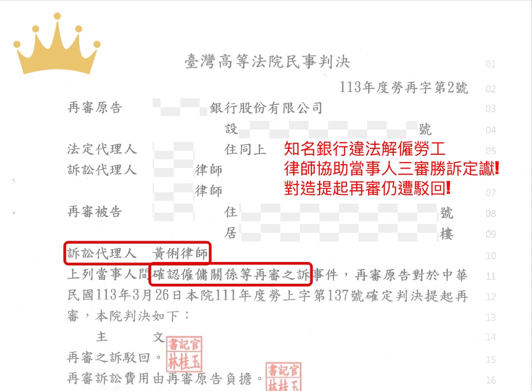 獲臺灣高等法院勝訴判決【高等法院113年度勞再字第2號】